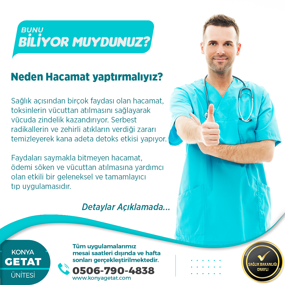 Hacaat tedavisinden faydalanmak ve daha zinde olmak için Sağlık Bakanlığı onaylı bir ünite olan KONYA GETAT’ı arayarak hacamat için hemen randevu alın.